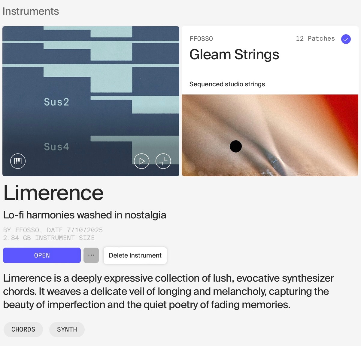 To uninstall an instrument from within FFOSSO, find its Instrument tile in the Library section, click it to show the details, and press “Delete instrument” in the “…” menu next to the Open button.